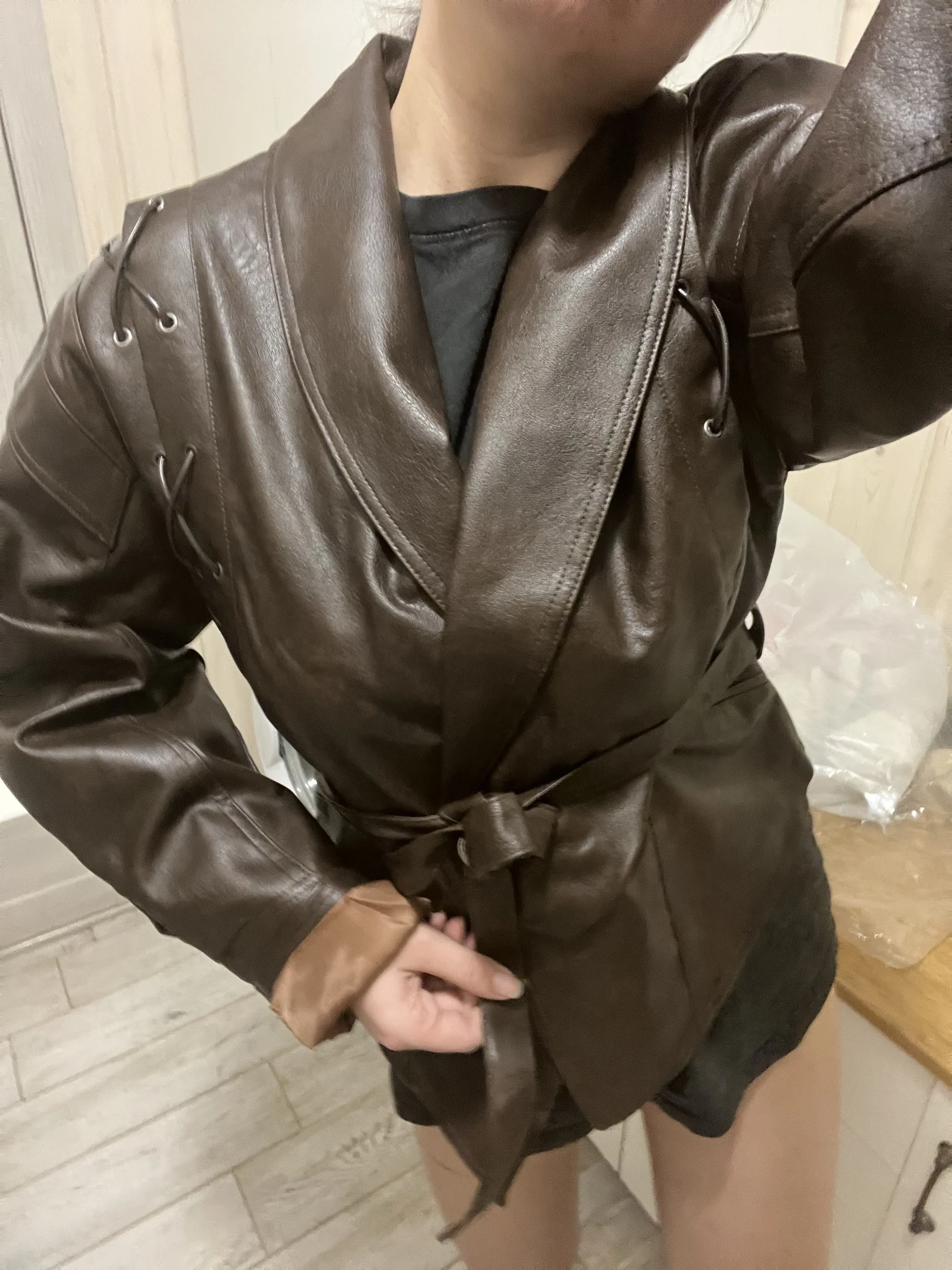 E.S. Very cool leather jacket, came without a smell, looks very stylish and expensive. The only thing I miss is one more button, but it's okay without it.